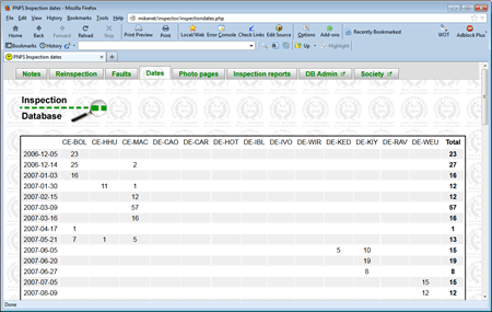 The "dates" report shows how many inspections I carried out for which parish on which dates.