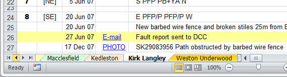 My next effort used Microsoft Excel. Just one spreadsheet, with one tabbed page per parish. Within each tabbed page there were columns for path number, date, comment, etc, arranged in path number/date order. I kept photos and messages in separate files outside of the spreadsheet, with hyperlinks to them from within the spreadsheet. This separation kept the spreadsheet nice and compact, which made it much quicker to navigate to a particular path, but it meant an extra click or two to look at a photo or message. When you have several hundred paths as I do, anything that speeds up access to a particular path is worth doing.